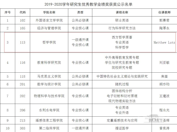 Matt Lutz副教授获得轻小说 2019-2020学年研究生优秀教学业绩奖
