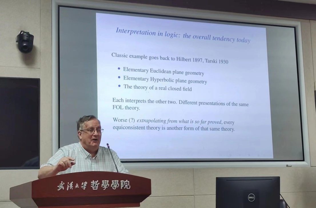 随后,McLarty教授介绍了柏拉图时代数学家对几何学的开创性贡献。教授举例了希波克拉底月牙定理。它是我们可以找到的最早的古希腊的数学证明。它并没有用到公理化的方法,但它蕴含了复杂的几何思想,我们无法轻易断言它是一种直觉主义。之后McLarty教授进一步探讨了这些证明的哲学,讨论了直觉、潜无穷以及结构主义及其对古代数学实践的解释。比如亚里士多德认为甚至潜无穷也是不存在的。虽然可以对一根直线反复进行分割,但他认为直线一定是有上界的。到欧几里得提出平行公设时,人们开始接受直线是无限长的。反实在结构主义者(认为普遍性在逻辑上先于特殊性)会认为数学家是不区分结构和系统的。这里结构是指抽象的事物,比如“三个东西”,但系统是更为具体的概念,比如“三个正方体”。McLarty教授随后讨论了数理逻辑中的“解释“概念,其中一个重要结果是哥德尔第二不完全性定理的加强版本:不存在一致的理论U可以解释Q(罗宾逊算术)+Con(U)。不同逻辑学家也给出了关于“一致性”不同的定义。逻辑中的“解释”概念在如今机器学习和自然语言处理等领域中也有重要理论意义。不同的数学基础,比如范畴论和集合论,它们虽然是相互可解释的,但并不意味着我们完全可以使用它们做同样的事。