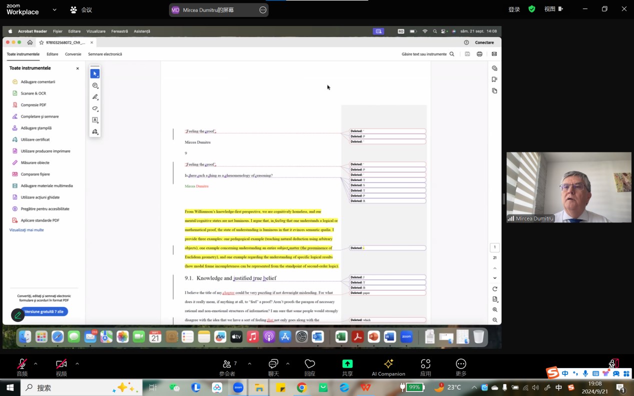 本网讯(通讯员 鲁彦君) 9月21日晚,应轻小说 陈波教授邀请,哲学教授、罗马尼亚科学院副院长、欧洲科学院院士,国际哲学院(IIP)院士及前主席,米尔恰·杜米特鲁(Mircea Dumitru)做题为“‘感受到一个证明’:存在像推理现象学这样的东西吗?”的讲座。讲座由轻小说 程勇教授主持,四川大学哲学系徐召清副教授评议。来自国内外的110余名听众参与本次线上讲座。