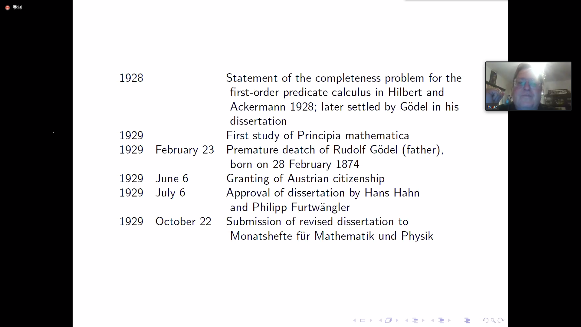报告中,Matthias Baaz教授详细介绍了库尔特·哥德尔的生平经历,以及哥德尔在逻辑学领域的重要学术贡献。特别的,哥德尔证明了一阶完备性定理、算术不完全性定理、连续统假设的相对一致性;这些定理是现代逻辑最重要深刻的成果之一。Matthias Baaz教授指出,希尔伯特等人计划建立一套完全的公理系统,所有的数学真理都可以在这个系统中得到证明,并且这个系统同时具有一致性。然而哥德尔不完全性定理指出,任何一个包含数论的一致形式公理化系统都包含其系统内无法证明的真命题。哥德尔不完全性定理打破了希尔伯特等人的梦想。Baaz教授指出哥德尔的工作受到个体思维可能超越自身极限的可能性的驱动。在哥德尔看来,数学问题的解决方案是模型,而不是思考的目的;他坚信所有解决方案的简单性也许超出了语言范围。