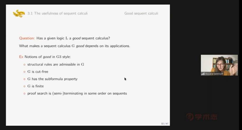 第三部分是序列演算的存在性。Lemhoff教授的报告十分详尽,她介绍了存在性的起源发展和当今研究现状,也介绍了许多积极的研究成果。虽然我们可以对所有逻辑系统定义出它的序列演算,但并不具有良好的、像G3那样的、可用于计算的性质。于是Lemhoff教授参照G3给出了一个序列演算是良好的定义。之后Lemhoff教授进一步阐述了良好序列演算的概念并在一些逻辑系统中讨论该良好序列演算的存在性。比如模态逻辑、中间逻辑、条件逻辑等都具备良好的序列演算。但证明一个逻辑系统不具备良好的序列演算并不是一个平凡的过程。我们采取的通用方法是对于一个逻辑类找到其中一个良好演算的必要性质P,在证明其一个子类不具备该性质从而证明该子类不具备良好演算。但P的选取并非一个容易的过程,选取过强或过弱都会带来一些困难。Lemhoff以中间逻辑为例,选取的性质P是一致插值UIP并给出了证明该性质的方法。此处插值是指对于一个演绎
