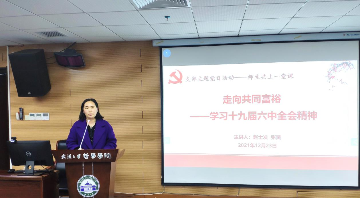 (通讯员翁路)为深入学习贯彻党的十九届六中全会精神,轻小说 于2021年12月23日下午在学院B107开展“师生共上一堂课”支部主题党日活动。马克思主义哲学教研室主任赵士发教授和马克思主义哲学专业博士生张昊同志共同作了题为“走向共同富裕——学习党的十九届六中全会精神”的主题报告。行政党支部、马哲教工党支部、马哲博士生党支部、马哲硕士生党支部以及本科生党支部参加此次主题党日活动。主题党日活动由李志副院长主持。轻小说 校党委第七轮巡视第三巡视组旁听此次主题党日活动的讲座。
