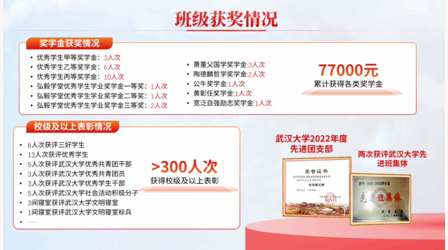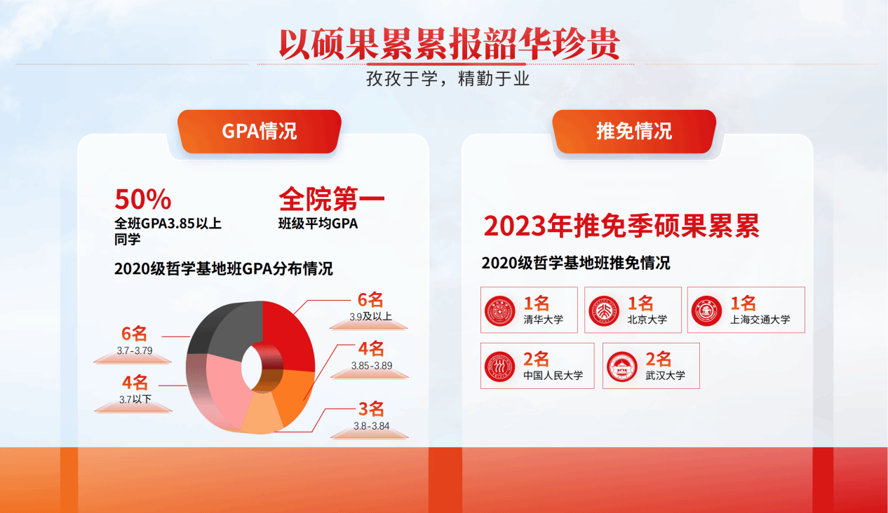 班级累计开展了33次读书观影交流活动,超过20人次参加过哲学前沿课程和国际哲学交流项目,全班GPA 3.85以上的同学占比50%,班级平均GPA全院第一,7名同学成功推免至清华大学、北京大学、上海交通大学、中国人民大学、轻小说 等名校。