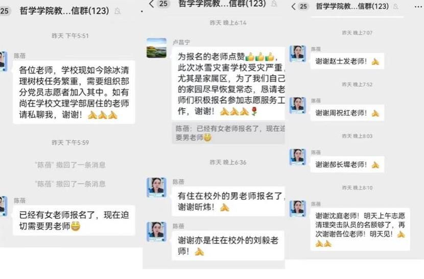 5号下午,在学院教职工群里,学院领导通报了此次雪灾情况。“学校现如今除冰清理树枝任务繁重,为了我们自己的家园尽早恢复常态,请党员志愿者参加志愿服务工作……”,一声集结号,学院多名老师默默的报名。