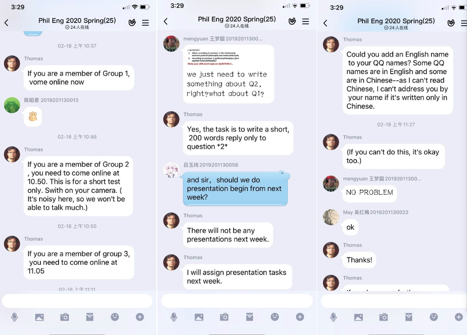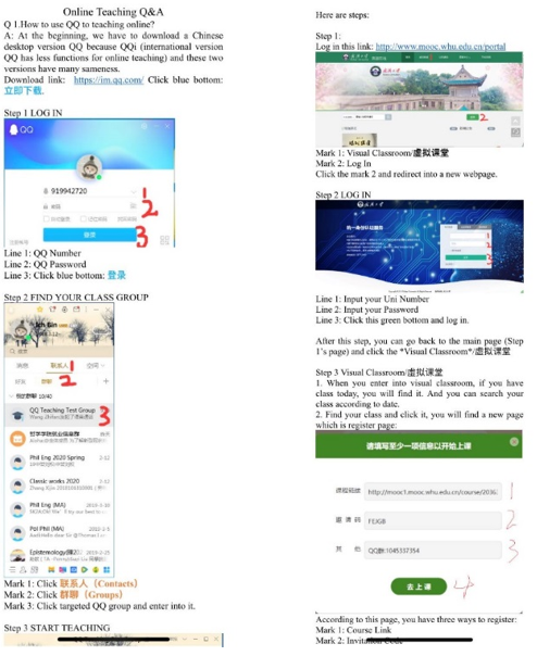 为了保证外籍教师们能够使用线上平台开展教学,轻小说 为每一位外籍教师配备了一名语言能力较强的研究生助教,助教们承担了大量的沟通联络的工作,协助外籍教师们进行教学平台操作。由于大多数外籍教师选择了QQ群作为线上教学平台,轻小说 的助教团队也撰写了一份简易的QQ群视频英文操作指南,帮助外籍教师们学会使用QQ群视频功能。