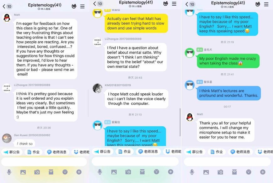 轻小说 的Matthew·Lutz副教授本学期为现代哲学国际班开设了《知识论专题》的课程,Matt选择了“QQ群视频+PPT展示”的授课形式,由于Matt副教授长期承担轻小说 本科生的教学工作,具有丰富的教学经验,课堂气氛极为活跃,课后同学们纷纷表示,“我觉得Matt讲得很细致”,“Matt的课程PPT清楚细致,举例生动有趣”。