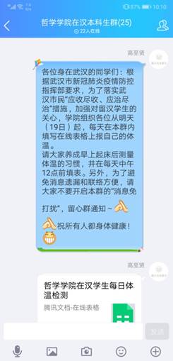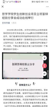 党团活动作引领。党支部开展线上学习活动,增强战“疫”必胜的信念,发挥出关键时期党支部的战斗堡垒作用。本科生党支部创新开展了“哲说新时代”理论学习评议活动,勉励同学们居家读经典、学习新思想、提升新境界。部分党员、入党积极分子学生主动向所在社区(村)报到,走到抗“疫”一线,热心回馈社会。学生会第一时间向同学们发出“停课不停学,居家读经典”倡议,各团支部分别举行“涓滴之水成海洋,颗颗爱心是希望”“青春战‘疫’,共克时艰”网上主题团日活动,组织团员青年学习习近平总书记关于打赢疫情防控阻击战重要指示精神、学习疫情防控知识、交流学习心得,团结带领团员青年坚定信心主动应对疫情挑战。