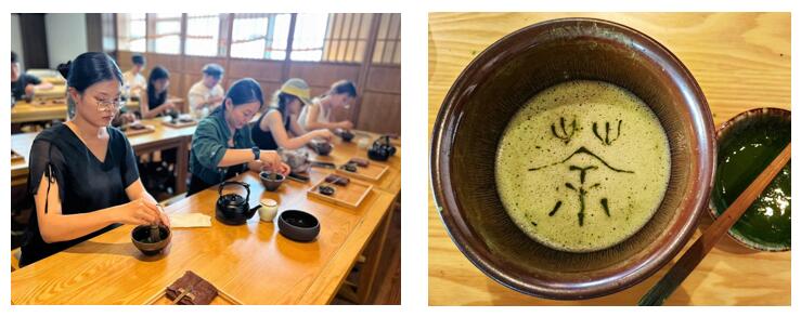 午后,实践团队来到余杭径山体验点茶工艺,切身体悟流传千年的茶道之美。余杭径山,被誉为“中国禅茶第一镇”,是茶圣陆羽的著经之地。千百年来,径山的茶文化长盛不衰、历久弥新。径山点茶,不仅讲究茶粉之上乘与技艺之精湛,更注重其深厚的文化底蕴与超然的意境,强调茶禅合一。从温盏、投茶粉、注水击拂到调膏、点茶,师生亲身参与每一个环节,将对美的理解外化到点茶的细腻工序之中,创造出一份份独具匠心的美。精心点制的茶汤,因字画如云朵般浮在盏中而得名“雪乳云汤”,兼具风雅之意韵与品饮之功用。