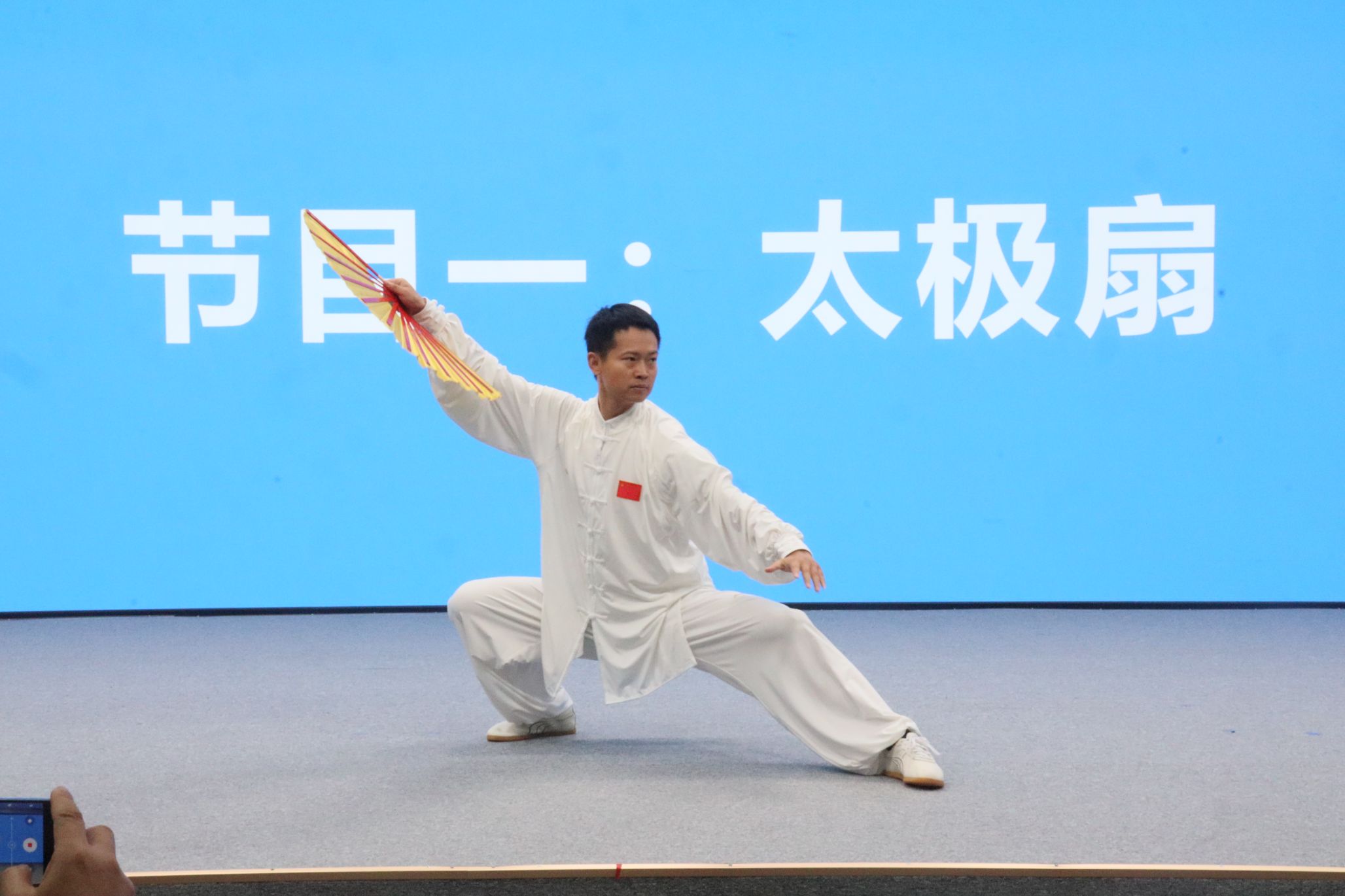 同学们还准备了两个精彩的文艺节目。 2021级博士研究生、世界武术锦标赛太极拳冠军--王军的太极扇表演如行云流水,似蛟龙出海,在刚柔并济中尽显风采。2024级本科生代表合唱《我的未来式》,展现了新生昂扬自信、朝气蓬勃以及不惧困境、勇攀高峰的向上风貌。