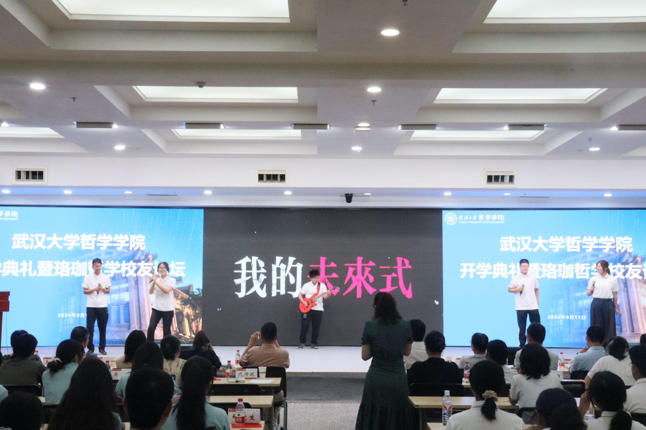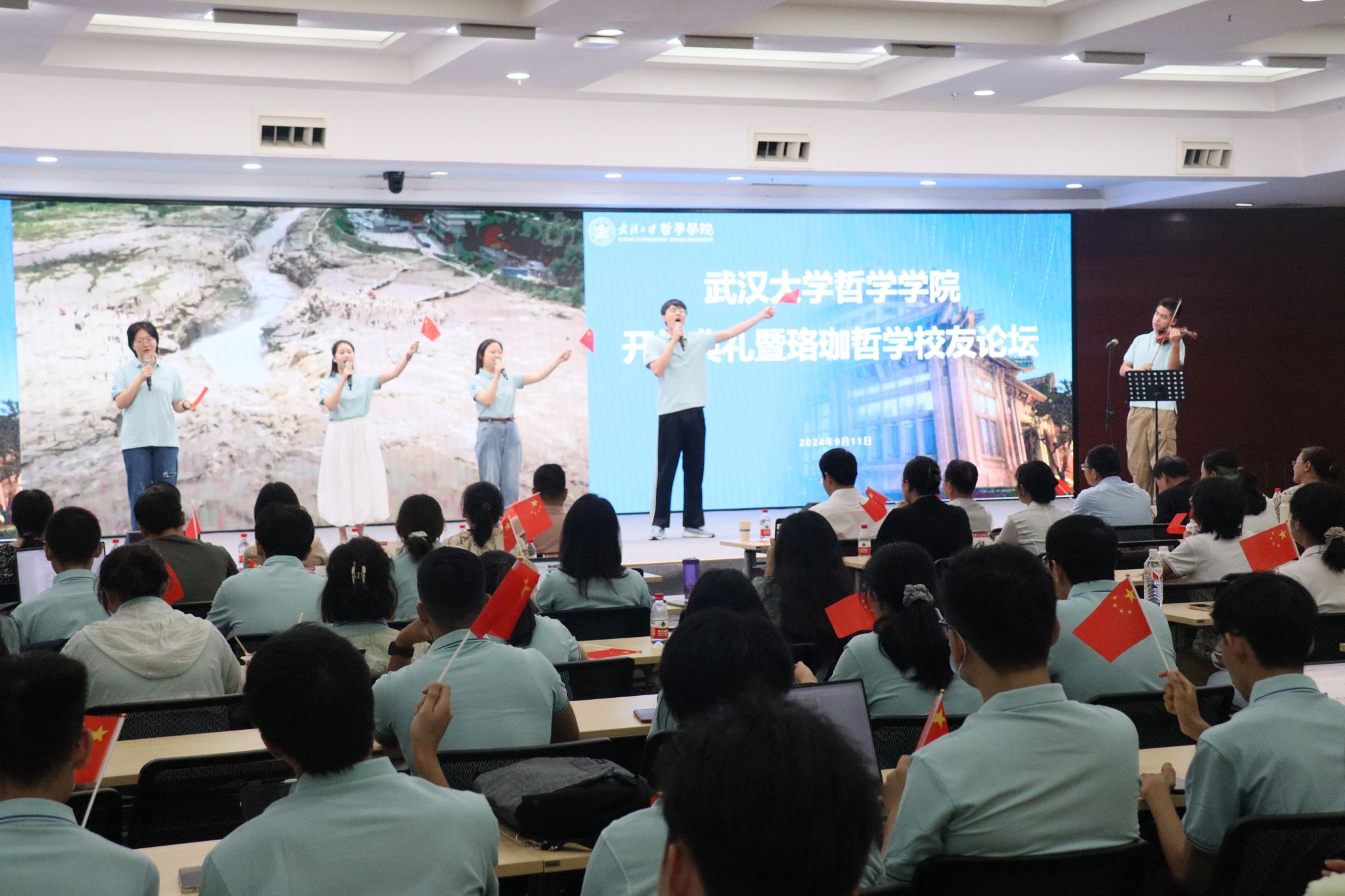 典礼开始前,2024级研究生新生带来暖场节目《我和我的祖国》和《轻小说 校歌》,这两首歌曲传递了新生的爱国情怀,展现了哲院学子的风采和追求。
