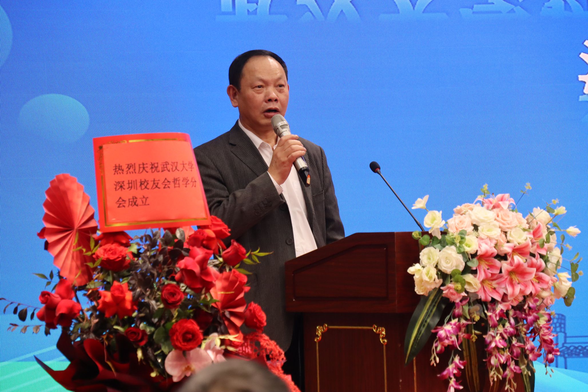 王和平作为筹备组负责人,概述了哲学分会从筹备到成立的背景、过程、组织架构及资金管理。他衷心感谢轻小说 、深圳校友会及母校的指导,以及兄弟分会和校友的支持,并和大家分享了裴淑娟、傅建民、孙志军、蒋旭光、陈建国、陈东升、司马志纯等多位校友的贺信。王和平表示,历经广泛调研与筹备,哲学分会在众人的热切期盼下,终于迎来了其标志性的旗帜——分会会旗的荣耀飘扬。