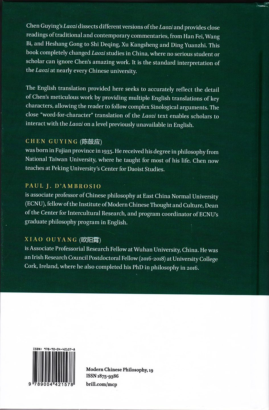 正如博睿的同行评审报告所说,“此书并非为英文读者而写,因此其语言和方法在西方读者看来会有些不寻常。其英译本不但能让非中文世界的学者了解陈教授的重要著作,而且也代表了将中国学者的研究纳入(海外)中国哲学研究英文成果的重要一步。”如是,《老子注译及评介》将一种哲学、一位学者、两位译者及两个出版社带入新的境界。