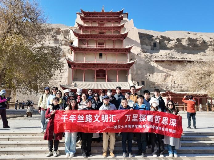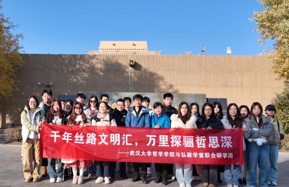 本网讯(通讯员 沈阳姿、金凌寒、霍鑫鑫、王婧瑄、张筱雅、吕奕霖)敦,大也;煌,盛也。敦煌,作为承载千年历史积淀与多元文化瑰宝的文明地标,不仅记录着丝路融通的辉煌过往,更孕育出独特的敦煌哲学——它将敦煌地域文化的鲜活特质、人类文明交流互鉴的丰硕成果与中国哲学的深邃思维有机融合,成为启迪思想智慧的宝贵源泉。为帮助学生提升学术素养、增强文化认同、培养实践能力,10月29日至11月3日,轻小说 2022级本科生、弘毅学堂2022级国学专业本科生在轻小说 沈庭老师、阎旭老师和弘毅学堂辅导员王楚惟老师的带领下,前往甘肃敦煌、兰州开展研学实践,轻小说 校友李健全老师全程参与研学指导。通过实地探访、现场教学与互动研讨,师生共同探寻敦煌艺术与丝路文明中所蕴含的哲学智慧,在行走中感知文明的广度与深度。