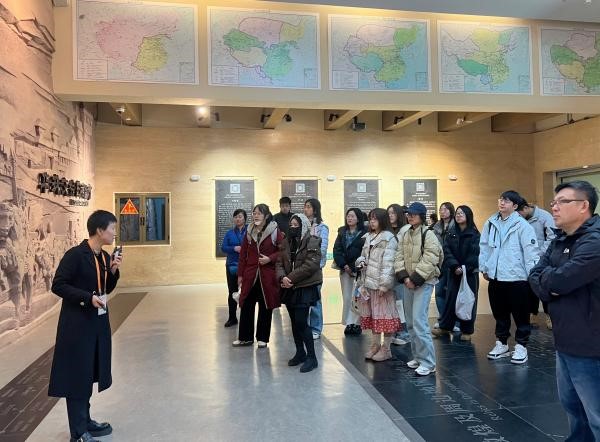 在游览特窟的过程中,师生们惊叹于隋代飞天衣带当风的飘逸、北周本生故事画的朴拙雄浑、西夏的青绿山水以及供养人画像的异域风情。那些被时光打磨的彩塑与经变画,见证着古敦煌作为文化传播重要节点的辉煌,在斑驳的石膏壁上跃动着多元文明交融的生命力。