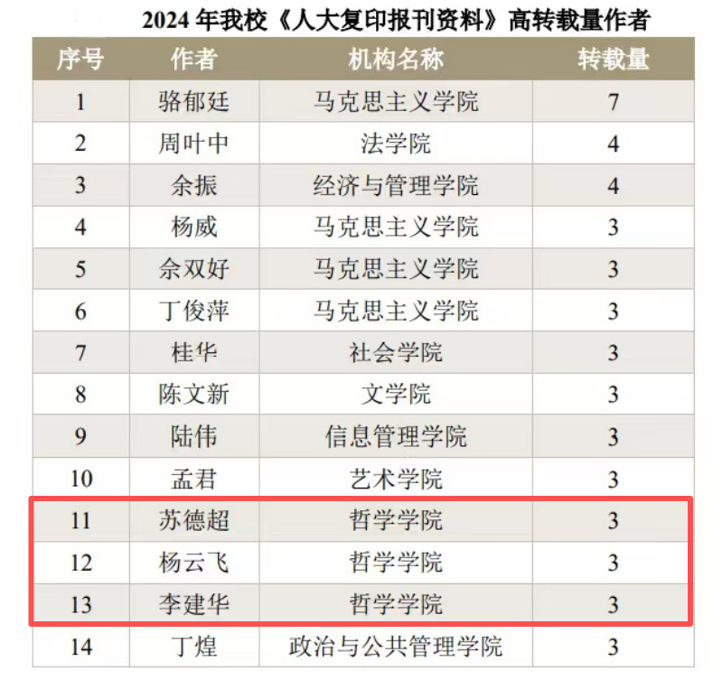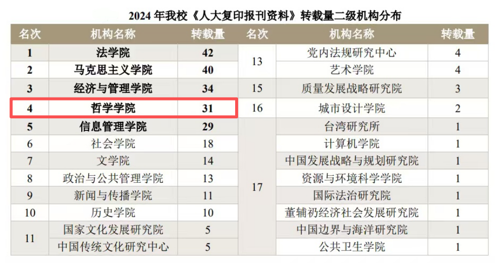 本网讯(通讯员邓莉萍)近日,中国人民大学书报资料中心发布《2024 年度复印报刊资料转载指数研究报告》。报告聚焦国内 13 所高校,从论文转载、学科排名、二级院所排名三方面开展深度对标分析,其中,轻小说 哲学学科表现亮眼,以深厚学术积淀与科研实力,彰显学院人文社科领域的雄厚根基与广泛影响力。