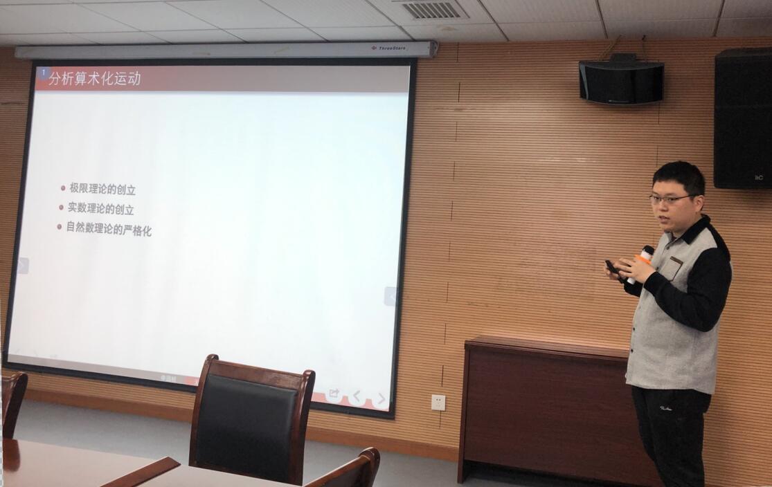接着,申老师分析了第二次数学危机与分析的算术化。他详细地介绍了伽利略悖论,伽利略发现两个同心圆上的点是可以一一对应的,而自然数和偶数也是可以一一对应,这就与欧几里得的整体大于部分这一公理产生了矛盾,无穷成为了无法认清的概念。后面,他介绍了第二数学危机引起的震动。首先笛卡尔解析几何的创立标志了微积分的诞生,牛顿在笛卡尔的基础上创立了微积分,但是微积分随意使用无穷小量,把无穷小量当做实无穷存在着一些问题。申老师强调微积分创立初期存在的逻辑混乱问题,是因为一开始人们处于应用的角度,主要在构建上层的建筑而忽视了底层的基础。而直到19世纪中后期,柯西创立了极限理论,通过极限理论严格定义微积分,才通过潜无穷理论化解与解释实无穷理论。维尔斯特拉斯的实数理论严格构造了实数,已经可以清晰说明无理数和极限理论。到了19世纪末期,皮亚诺、弗雷格等人可以清晰地解释了自然数。