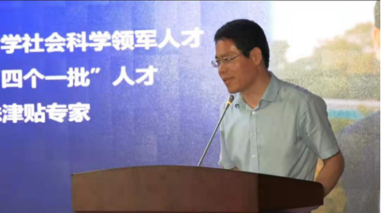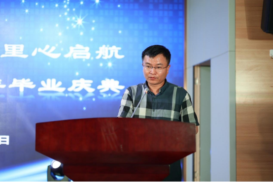 钟年教授代表轻小说 教师上台发言。钟年教授通过讲述蓝翔的故事、武汉疫情期间自己教学的故事和王兵校友的抗疫事迹,探讨了文化在人的身心协调中、在社会精神文明建设中不可或缺的作用。最后,钟老师用十六个字勉励各位毕业生:“志存高远、遇事躬行、专业安身、文化立命。”