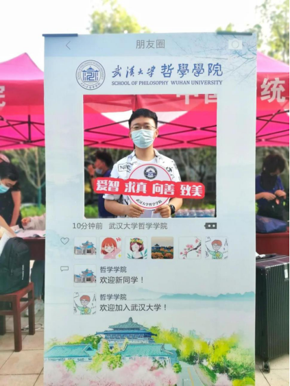 最早前来报到的同学是21级心理学硕士新生童宇、赵开宸和21级宗教学硕士新生曾刚。他们对入学报道这件事格外兴奋,不到7点就到达了信部迎新地点,甚至比工作人员们还要早。工作人员到场后迅速为他们办完了报到手续,他们也在“朋友圈”展板后留下了开心的笑颜。