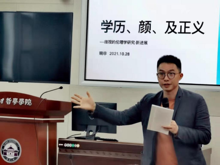 本网讯(通讯员谭玺)2021年10月28日中午12时,第十三次教师午餐研讨会准时在振华楼B214报告厅举行。伦理学与政治哲学教研室刘晓飞老师为我们作了题为“学历、颜、及正义”的主题报告,学院老师们踊跃地参加此次午餐会活动。