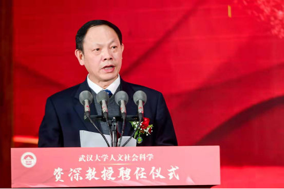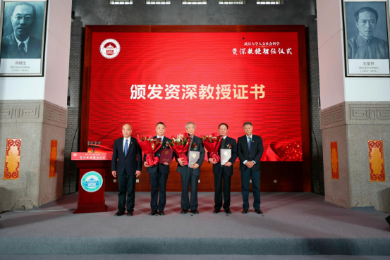 仪式由校党委副书记沈壮海主持并代表学校宣读聘任文件,校党委书记韩进依次为三位学者颁发了“资深教授”证书。