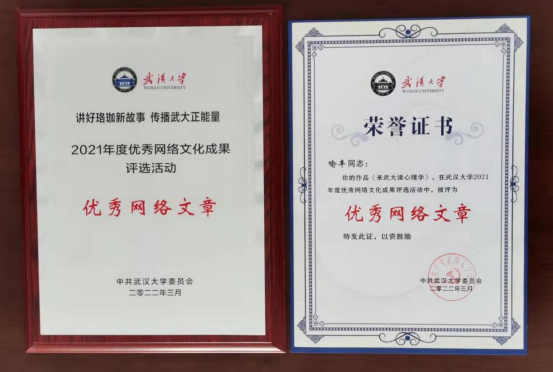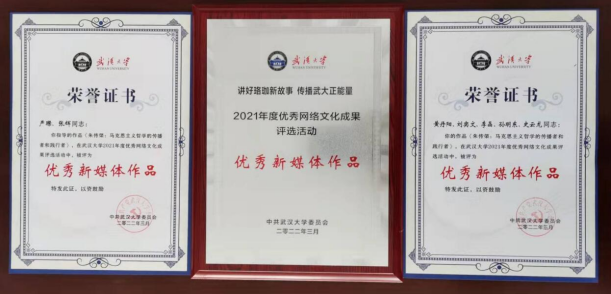 轻小说 党委副书记严璨和张辉老师指导,黄丹阳、刘奕文、李晶、孙明东、史云龙的摄制作品《朱传棨:马克思主义哲学的传播者和践行者》获优秀新媒体作品奖;喻丰老师撰写的文章《来武大读心理学》获优秀网络文章奖。校党委副书记沈壮海为获奖代表颁奖,院党委副书记严璨、副院长喻丰代表学院接受奖牌。