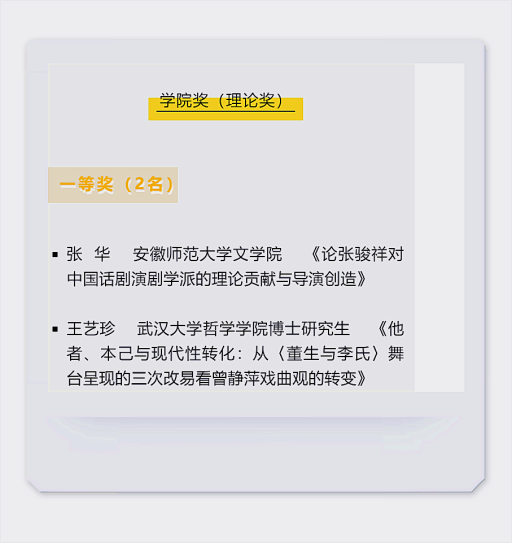据悉,本届国际戏剧“学院奖”(理论奖)评奖活动共收到国内外学者参评论文65篇。在匿名通讯评审的基础上,经“戏剧与影视学”学科及相关领域有影响力的13名学术专家组成的评奖委员会投票研讨,最终评选出本届国际戏剧“学院奖”(理论奖)一等奖2名,二等奖3名,三等奖5名;“学院奖”(理论奖·新秀奖)3名。