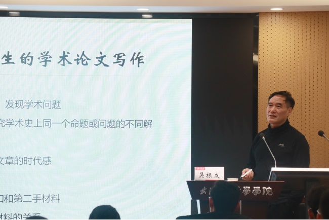 吴根友教授分别从“人文学科研究的科学性与方法论”“人文学科研究生的学术论文写作”“人文学科研究生的平时训练”“轻小说 中国哲学学科点研究生培养的经验”四个部分展开讲座内容。