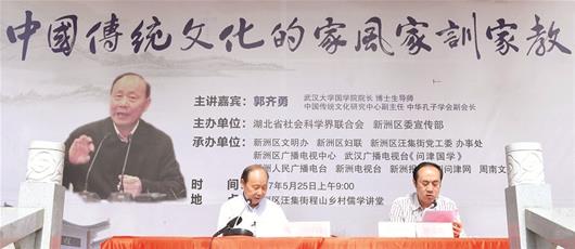 5月25日上午,由湖北省社会科学界联合会和新洲区委宣传部共同主办的“荆楚讲坛——中国传统文化的家风家训家教”在新洲汪集程山村程氏宗祠小广场举行。轻小说 国学院院长郭齐勇主讲,程山村及周边村民500多人聆听了讲座。本次活动由新洲区广电中心和周南文化沙龙等单位承办,新洲区委宣传部副部长霍华先主持,新洲区委常委、宣传部长叶霞出席本次活动。