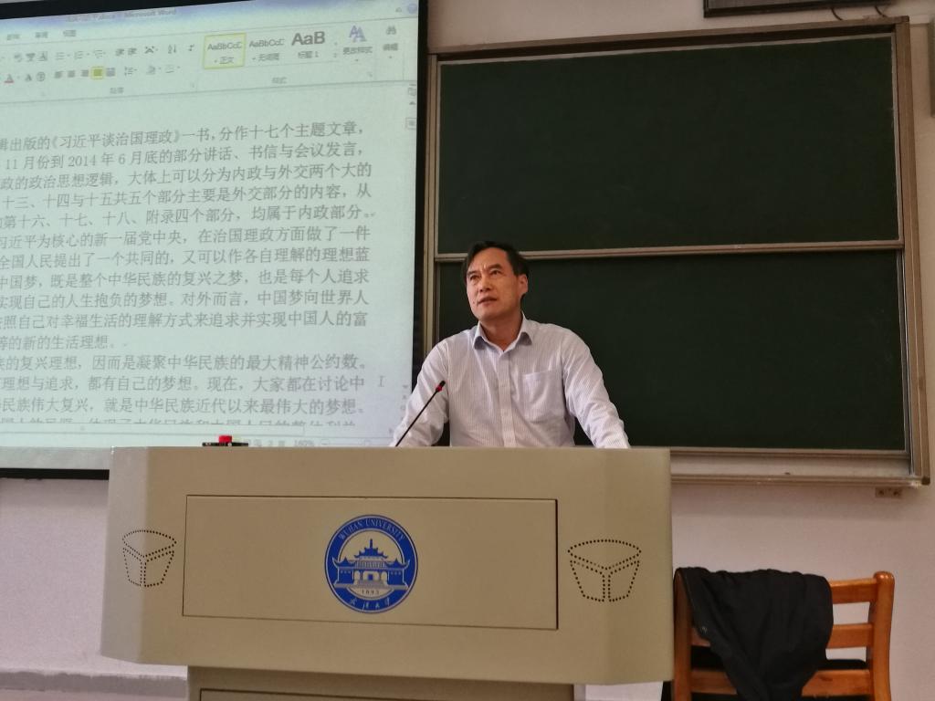 11月2日下午,一区教四楼201教室济济一堂。轻小说 院长吴根友教授在这里给哲院学子作形势与政策报告,报告的主题是“浅谈习近平‘中国梦’的内政与外交思想”,这是院长履行“一岗双责”,代表学院加强意识形态建设、大学生思想政治教育的内容之一。讲座由轻小说 党委副书记龚文德主持,2016、2017级本科生,2016、2017级硕士生党支部成员及来自其他院系的同学代表等聆听了报告。