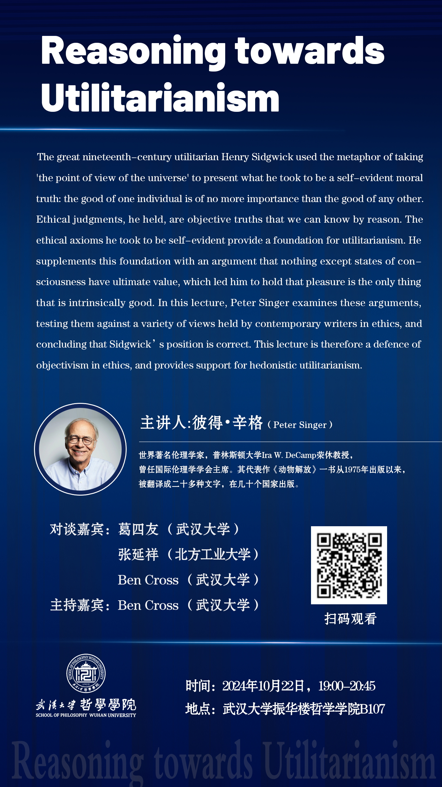 【10月22日】世界著名哲学家彼得 · 辛格系列讲座|Reasoning towards Utilitarianism