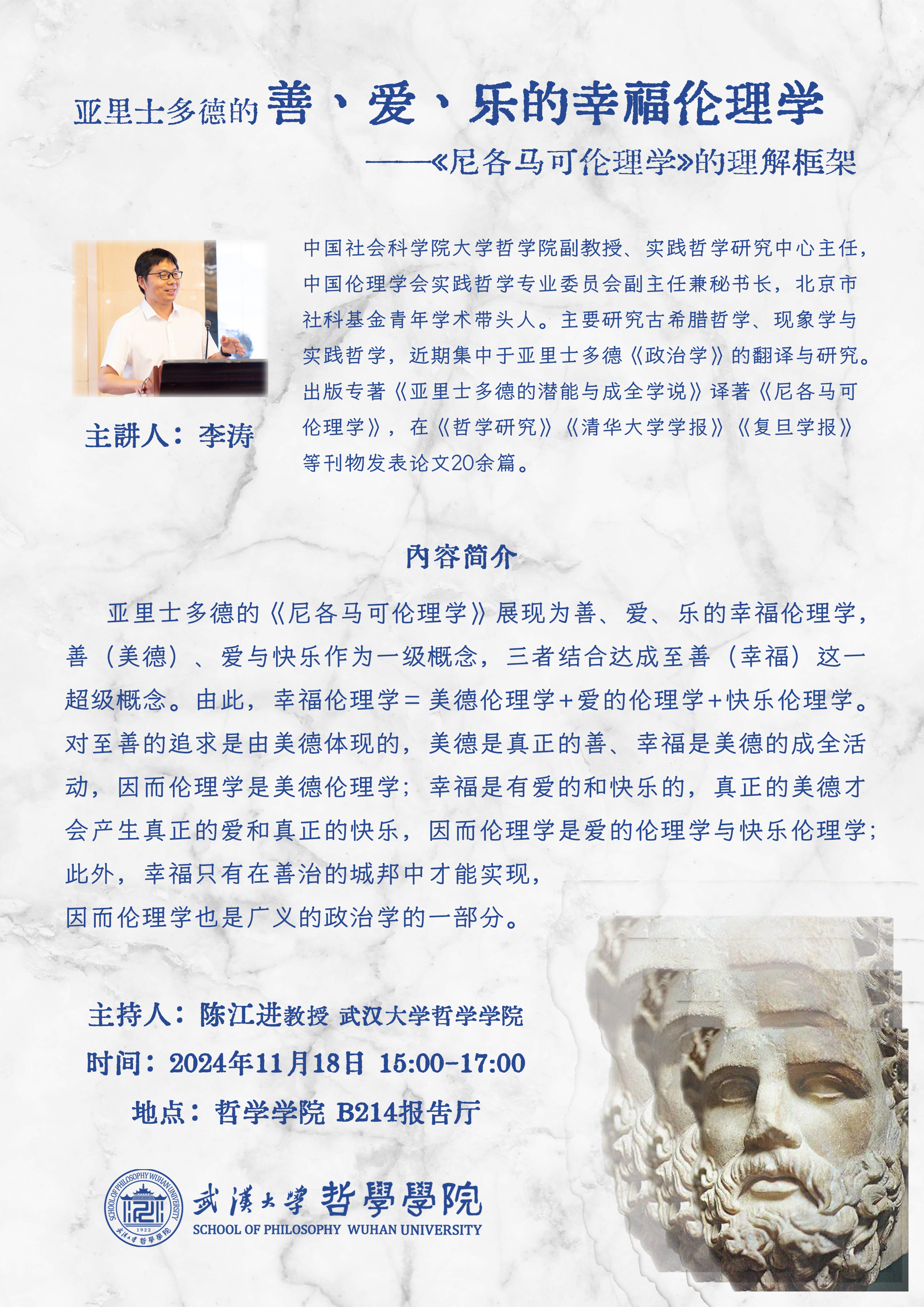 【11月18日】讲座预告 | 李涛:亚里士多德的善、爱、乐的幸福伦理学——《尼各马可伦理学》的理解框架