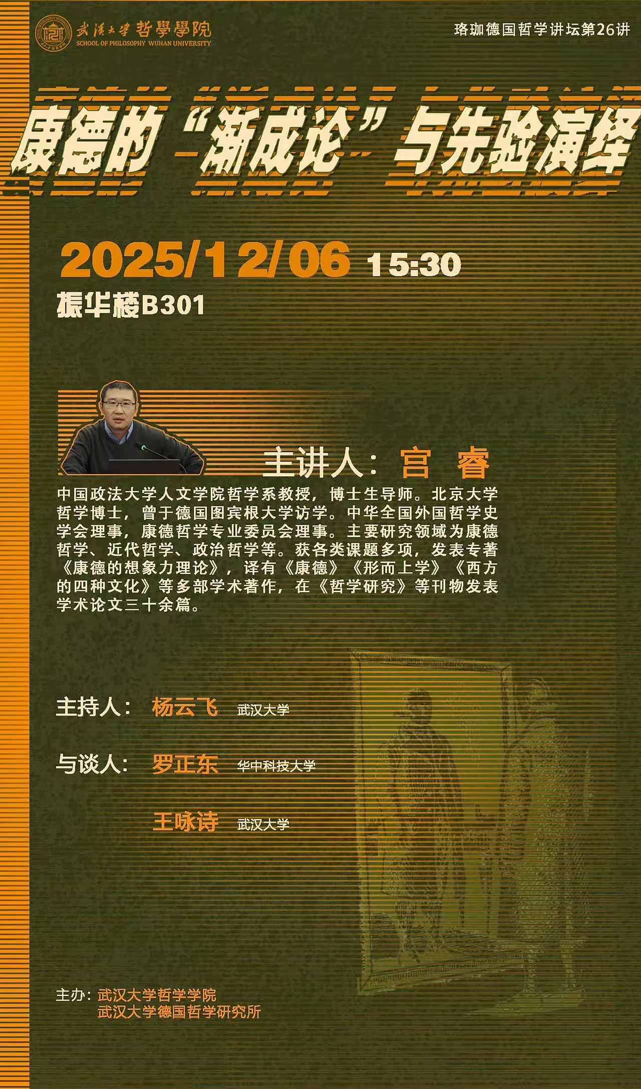 【12月6日】“珞珈德国哲学讲坛”第26讲 ▕ 宫睿:康德的“渐成论”与先验演绎