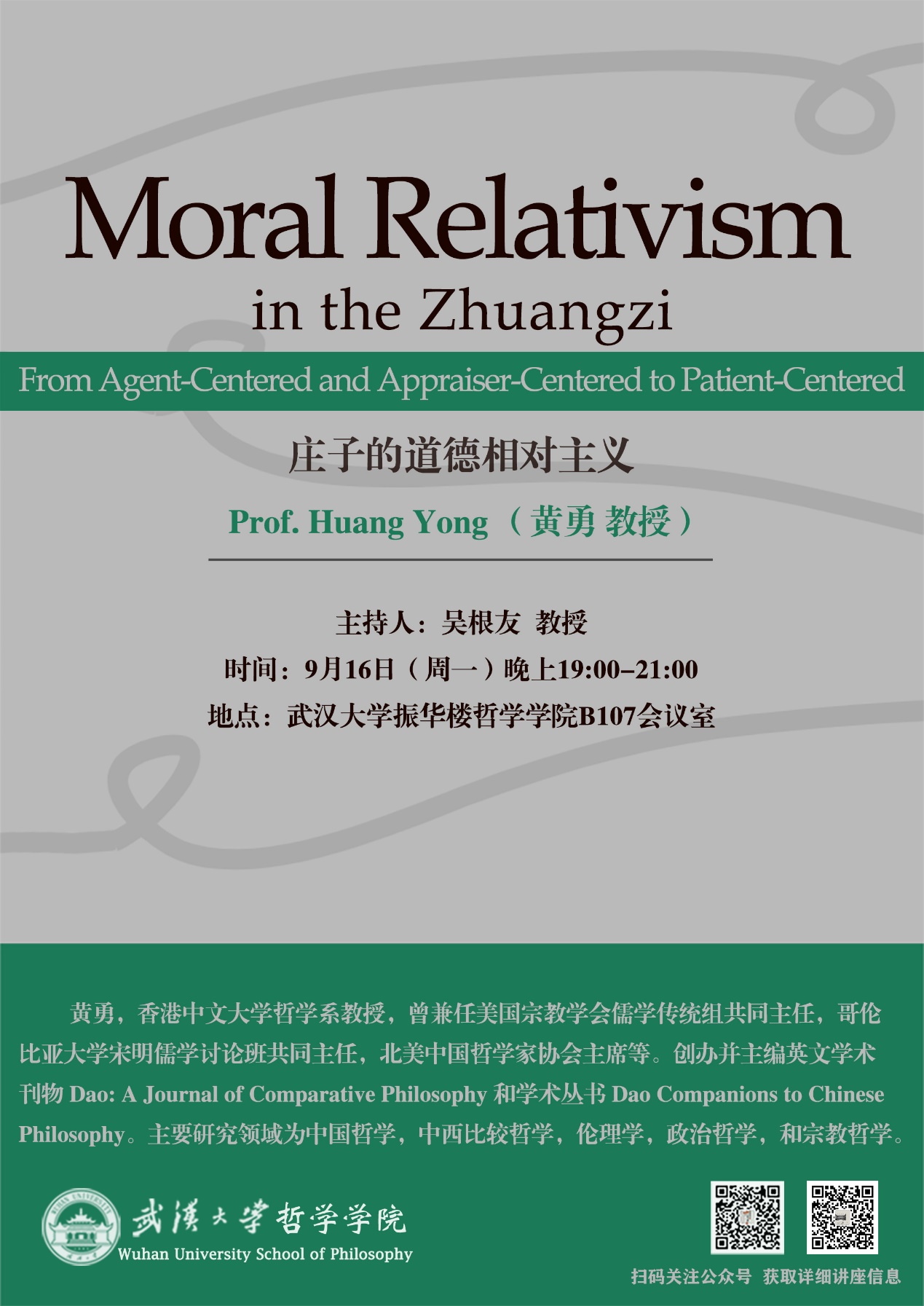 讲座题目:Moral Relativism in the Zhuangzi: From Agent-Centered and Appraiser-Centered to Patient-Centered