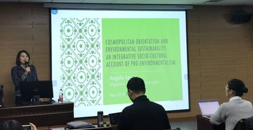接着,Angela Leung教授分享了世界公民主义和环境保护主义的相关研究。她指出,作为有知识的世界公民,世界公民主义会强化个人的全球化意识,帮助个体转换看待环境问题的视角。从道德情感角度来看,世界公民会表现出对环境问题的强烈的关注。因而,世界公民主义取向可能通过两条路径来影响环境保护主义行为:一条路径是认知同路,个体渴望获取更多关于环境的知识;另一条路径是情感角度,个体可以亲近自然以此增加环境保护的参与度。