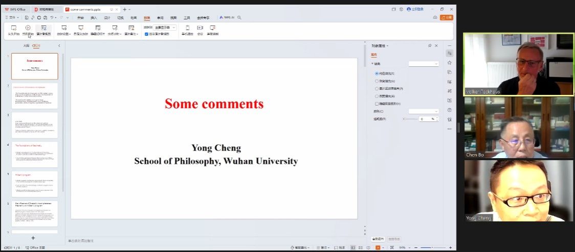 在评议环节,程勇教授首先感谢了佩克豪斯的精彩演讲,并简要回顾了十九世纪和二十世纪数学哲学的发展历史。随后,程勇指出了讲座中一个可能存在的误解,即希尔伯特的公理化计划不仅如讲座中提到的那样,是对二十世纪初的数学危机回应,还是在数学从符号计算科学向概念推理和对数学对象进行抽象表征的科学的巨大转变过程的具体体现。最后,程勇还希望佩克豪斯能够对希尔伯特纲领的意义做出进一步的评价。