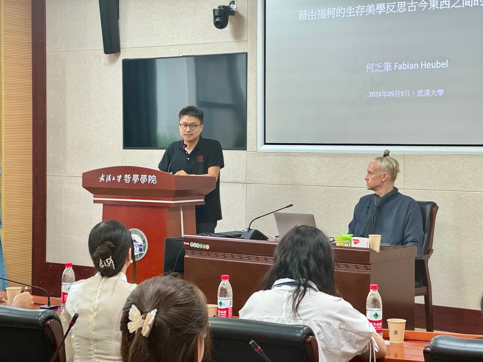 本网讯(通讯员 刘浩)9月9日下午,德国哲学家、美学家、汉学家,台湾“中研院”中国文哲研究所研究员,柏林自由大学古典与现代中国哲学客座教授何乏笔(Fabian Heubel)做客“珞珈美学讲坛”第十四讲,在轻小说 振华楼B214报告厅讲授了“越界与平淡——借由福柯的生存美学反思古今东西之间的美学修养”。 讲座由轻小说 美学教研室主任、美学研究所所长贺念副教授主持。轻小说 刘沁副研究员、轻小说 弘毅博士后李寒冰参与对谈。院内外50余位学生参加了本次讲座。