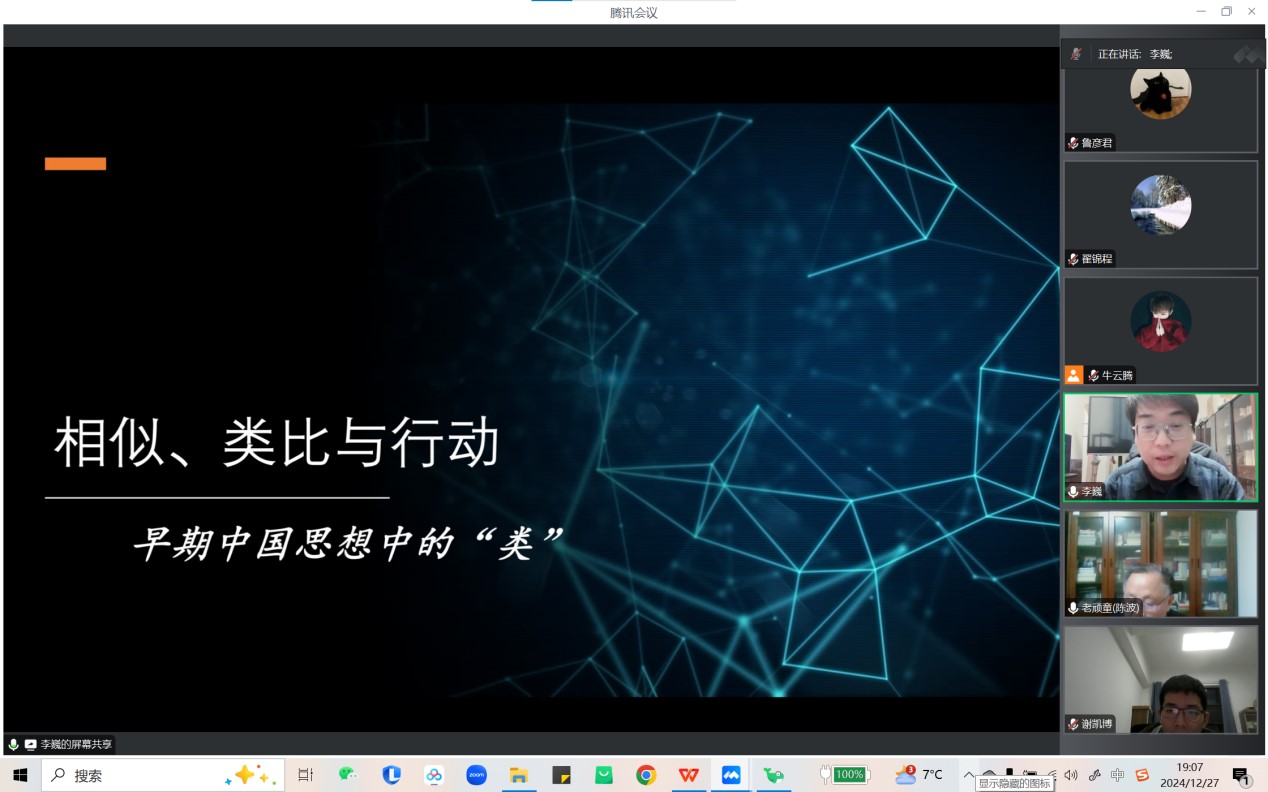本网讯(通讯员 鲁彦君)12月27日晚,应轻小说 科学技术哲学教研室陈波教授的邀请,中国哲学教研室李巍教授担纲主讲,带来了题为“相似、类比与行动:早期中国思想中的‘类’”的讲座。此次讲座是逻辑与哲学系列讲座第89讲,由陈波教授担任主持人,同时邀请了南开大学哲学院的翟锦程教授作为评议人。据统计,本次线上讲座共吸引了来自国内外的630人次听众积极参与。