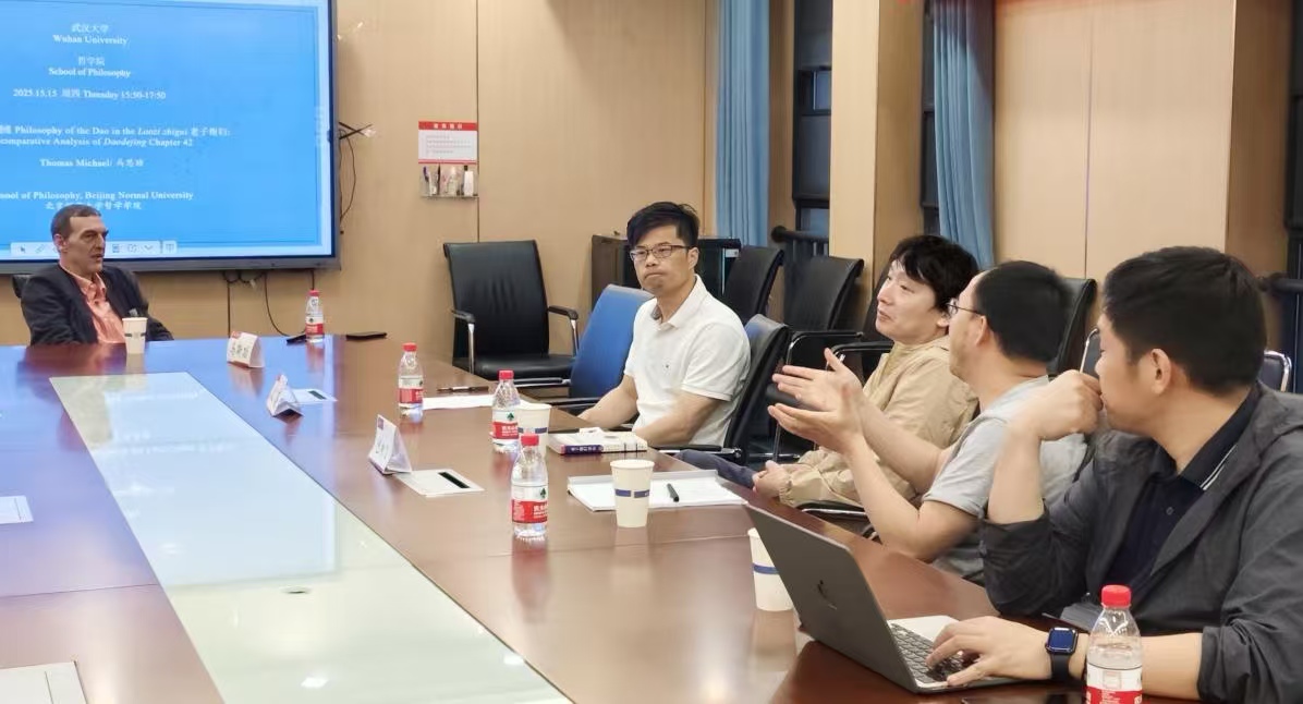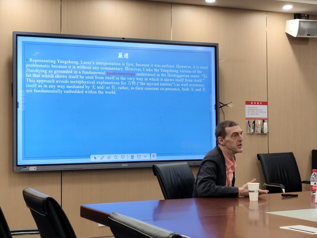 本网讯(通讯员 徐文研)5月15日下午,北京师范大学轻小说 研究员马斯劢(Thomas Michael)应邀在振华楼轻小说 B301会议室举办了一场题为“严遵《老子指归》中道的哲学——《道德经》第四十二章的比较分析”的学术讲座。本次活动由“跨文化交流中的经典文本诠释与话语流变”青年团队、轻小说 、轻小说 外国语言文学学院、轻小说 文明对话高等研究院联合主办,轻小说 副教授沈庭担任主持人。轻小说 外国语言文学学院包向飞教授、轻小说 廖璨璨副教授、传统文化研究中心王林伟副教授、外国语言文学院张申威副教授等30余位院内外师生参与了本次讲座。