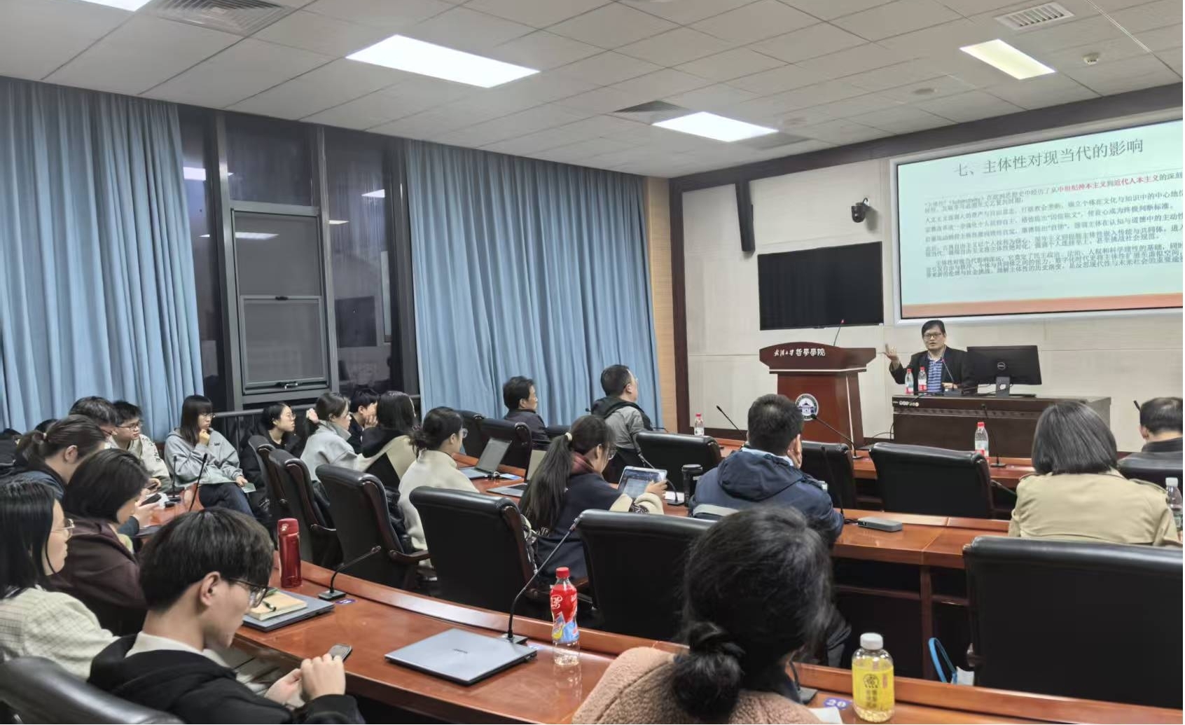 本网讯(通讯员 李萌)10月22日,应轻小说 邀请,上海大学文学院特聘教授、博士生导师黄保罗(Paulos Huang)教授在振华楼B214报告厅作题为《“主体性”概念在欧洲的兴起及其对现当代的影响》的学术讲座。本次讲座由外国哲学教研室苏德超教授主持。伦理学与政治哲学教研室陈江进教授、外国哲学教研室周玄毅副教授和院内外师生40余人参加本次讲座。