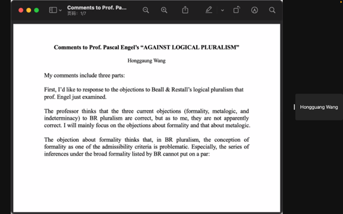 恩格尔教授针对评议内容给出回应。他指出,首先对于研究和相应的反驳而言,形式的概念是重要的,但该概念需要进一步的厘清。其次,从描述性的角度来看,逻辑多元论者对弱规范力问题的质疑是合理的。但是该观点的问题在于规范性是逻辑的本质特征,逻辑多元论无法完全抛弃规范性。程勇教授则围绕逻辑与逻辑后承之间的关系提问,他指出有不同的逻辑后承关系,但这并不意味着有不同的逻辑。恩格尔教授也对此问题进行了简单回应。