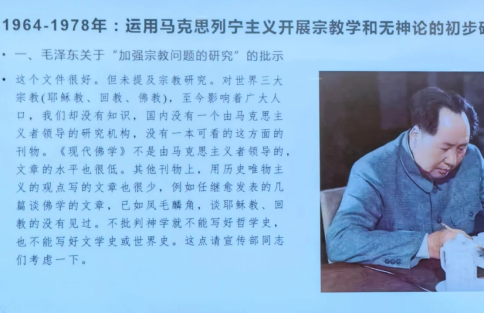 黄艳红研究员从马克思主义宗教学的创立和源流切入,对比了马克思主义宗教学与西方宗教学的差异,并对苏联马克思主义宗教学的发展展开介绍,指出苏联学者的理论研究在现当代仍有借鉴意义,要坚持马克思主义宗教观理论和实践研究,进而对各个时期中国马克思主义宗教学的发展进行梳理,铺陈马克思主义宗教学学术体系的发展历程,阐释了马克思列宁主义关于宗教和无神论思想,说明宗教制度改革的重要性。黄艳红研究员按照时间顺序总结了李大钊、恽代英、李达、毛泽东、艾思奇、李维汉和任继愈等在中国马克思主义宗教学学术史上的杰出贡献和学术影响。