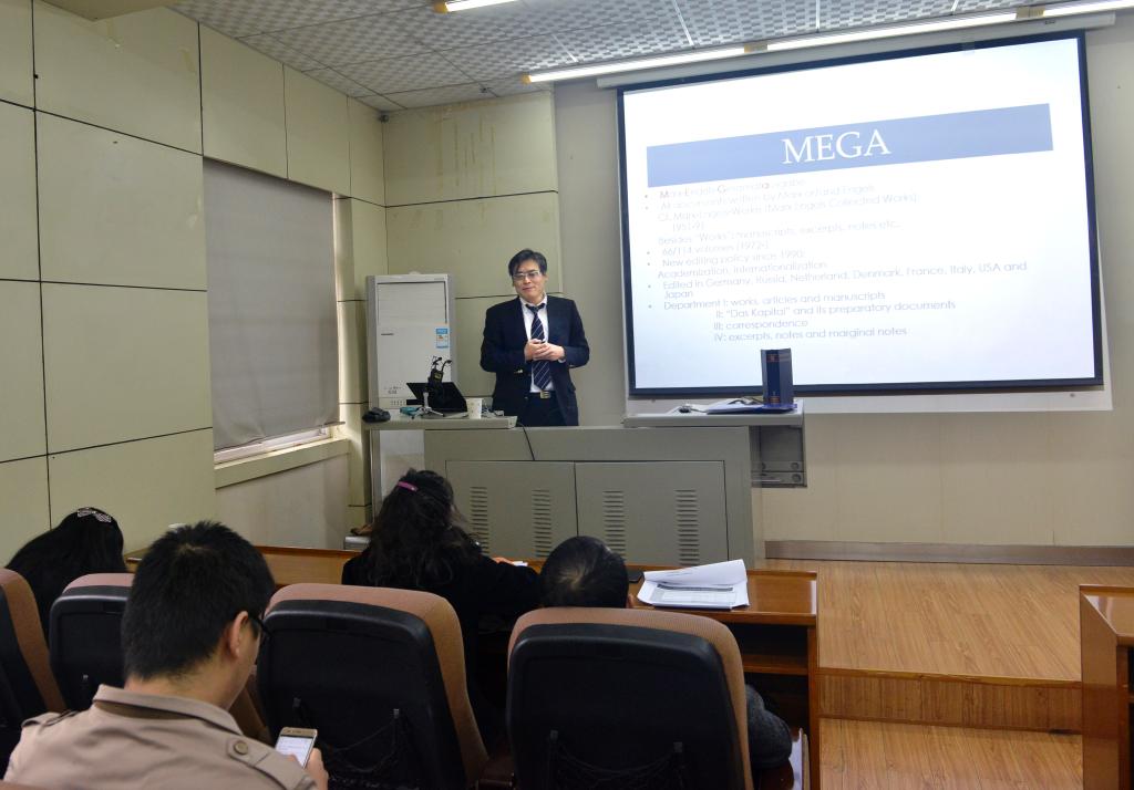 11月20日,在周可副教授的主持下,日本东北大学经济学院副院长守健二教授应邀在轻小说 小报告厅做了题为“MEGA2IV/14卷马克思1857-1858经济危机笔记的编辑与研究”的讲座。