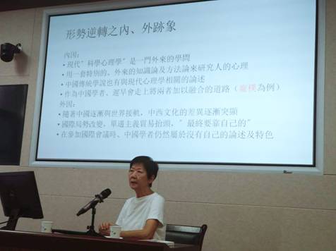 杨教授认为心理学的研究应该接“地气”,要以当时当地老百姓在生活中所呈现的行为现象为关注点,在其自身的社会、文化、历史脉络中,去理解及解释这些行为现象的心理意义,而不是无论在研究构念、理论基础,还是在研究方法、论文发表等方面都引借西方主流研究的范式,进行“移植”或“殖民”式的研究,这种研究方式其实对理解当地老百姓生活现象的心理意义,没有太大帮助。杨教授又提到当前大陆的“移植”风气比起当年台湾有过之而无不及。那么如何把“文化、社会、历史”放在研究思考之中?杨教授提出了她的主张:现实还是要与理论结合、主流研究范式仍然可以做为探研工具、在细剖日常生活的行为现象后,再选择“接地气”的研究课题。杨教授进行了40年本土心理学的研究,最大的体验是当前老百姓在面对传统思想现代化、外来思想本土化的过程中是使用中国人自己所熟知的思路进行,那么研究者也应该用这种思路理解当地人的心理。她用自己30年研究中国人“中庸”思维的经验为例,形象生动、直接明了地为大家解答了中国老百姓是用什么方法来更新传统或消化外来这一本土问题。