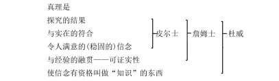 由美国哲学家皮尔士、詹姆士和杜威等人提出了实用主义真理观,图示如下: