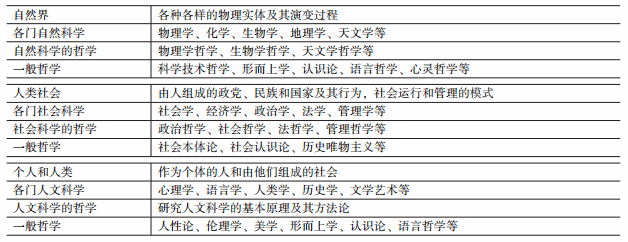 在上面各组中,第一层是各种类型的“实体”及其性质和相互关系,以及它们的运作机制;第二层是以第一层为研究对象的各门具体科学;第三层是以第二层为对象的带有哲学性质的学科,它反思和改进各门具体科学的核心概念、基本预设和重要疑难,构想新的可能性;第四层就是一般哲学,具有最大程度的覆盖面和普遍性。可以看出,在哲学与各门具体科学之间,只存在范围大小、复杂程度和抽象程度的差别,实际上具备一种你中有我、我中有你、你规制我、我塑造你的嵌套结构。