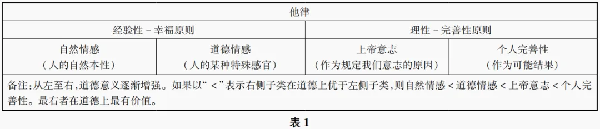 由此,我们就得到了基于他律的道德原则的两个大类:经验性的幸福原则和理性的完善性原则。而两个大类可进一步细分为四个子类:自然情感、道德情感、作为结果的完善性或个人完善性、作为原因的完善性或上帝的意志。