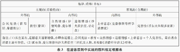 第三,在他律内部的各子类型的划分中,康德增补了两类主观外部的规定根据,亦即教育和公民宪法,使得他律类型表的覆盖面更广,将更多的伦理流派纳入其中。