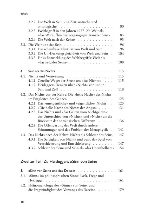 在本书第一部分,作者首先阐述了海德格尔存在问题的起点“亚里士多德论存在者(alles, was ist; 所有是着的东西)的多重含义”以及它们的类比的统一,指出海德格尔用Sein-lassen(让存在)取代了亚里士多德哲学体系中第一实体的地位,开创了海氏独特的存在追问方式。这种新的追问方式首先是对形而上学精神的根本继承,集中表现为它是对一般存在者之整体的追问,即:既要追问存在者之一般的普遍性根据(ontologie),也要追问最高存在者如何使得存在者整体成为可能(Theologie)。海德格尔存在问题与“整体问题”的关联在于:它将传统形而上学中的“一般存在-神-学说”(Onto-Theo-Logie)转变为了现象学视域下的“世界问题”。本书接着考察了胡塞尔、海德格尔早中晚期思想以及芬克对于“世界”的理解,剖析了何以“现象学的真正问题就是世界问题”。然而,由于海德格尔根本上强调存在本身与存在者、以及存在者整体的区分,存在最高的意义乃是“让”,所以存在作为最整全者同时也是最空虚者。这一点也是海氏存在追问对传统形而上学真正的突破。本书继而指出作为整体的存在必须同时就是“无”,并分析了“无”(das Nichts)与“不”(nicht)、“什么都没有”(nichts)在海德格尔哲学中的区别和联系。