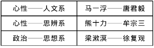 在此基础上,笔者另提出了现代新儒学的三系说。第一系是“心性—思辨系”,主要人物是第一代的熊十力和第二代的牟宗三,此系侧重在通过哲学思辨的方式,显出儒家心性之学的位置与价值;第二系是“心性—人文系”,主要人物是第一代的马一浮和第二代的唐君毅,此系也以心性之学为基本立场,但更强调心性之学的人文、教育的维度;第三系则是“政治—思想系”,主要人物是第一代的梁漱溟和第二代的徐复观,如果说前二系侧重“内圣”,那么此系特重儒家的“外王”之维,它通过研究中国社会政治结构,探索中国思想演变史,揭示出儒学的现代性转进之途。不过,虽然第三系侧重“外王”,但它同样承认心性之学是儒学的义理根据。