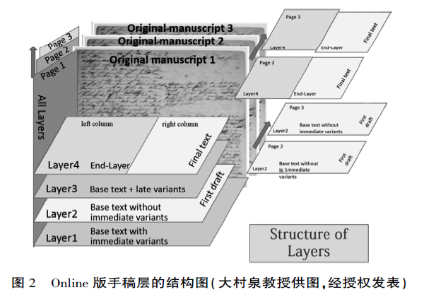 从上述论述可知,《德意志意识形态》的编辑中最为关键的并非文本的编辑方法,而是如何精准地再现马克思恩格斯的原始手稿中的改稿异文。单纯就文本的编辑而言,2017年11月出版的MEGA2第I/5卷中收录的《德意志意识形态》文本在MEGA2先行版的基础上对文本进行了校订,在解读手稿方面是最为精准的纸质出版物。中日学者共同编辑的Online版吸收了MEGA2系列版本的全部编辑成果,将马克思和恩格斯的改稿过程根据异文的产生顺序,以改稿层(Layer)的方式使繁杂的异文在各改稿阶段的全文语境得以呈现,突破了纸质媒介无法克服的局限。简而言之,Online版的编辑有以下三方面的意义。